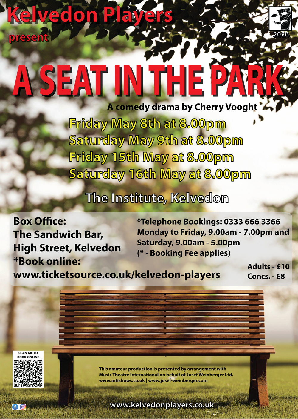 At Kelvedon Institute on 8/9/15 and 16 May 2026 at 8.00pm (Doors open 7.30)